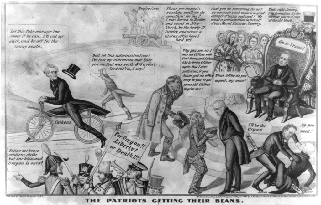 33. Clay, Edward Williams (attribution by Library of Congress); Lithography and publication by James Baillie, 1845; Library of Congress image — Summary: A satirical view of the scramble among newly elected President James K. Polk’s 1844 campaign supporters, or “patriots,” for “their beans,” i.e., patronage and other official favors. Polk (upper right) sits in the Presidential Chair, his hands folded and apparently oblivious to the activity around him. From behind the chair Andrew Jackson prompts him, “That’s right Jemmy, Non Committal. By the Eternal you’re a chip of the old block.” To Polk’s right a group of homely women present a petition and ask, “Can’t you do something for us? we are poor weak women in great danger of being seduced! We want a proclamation in behalf of our Moral Reform Society.” Below him John Beauchamp Jones and Francis Preston Blair, editors of influential rival newspapers, the “Madisonian” and the “Globe,” fight for the privilege of being the administration organ. In the center an Irishman, hat in hand, approaches Polk and asks, “Plaze yer honor’s worship, can’t ye do somethin’ for me? I was bor-r-n in Boston and rared in New-Yor-r-k, be the howly St. Patrick, and nivver a bit of an office have I had yet.” Nearby, a German or Dutchman walks away in disgust shouting, “Dod rot this administration! I’ve lost my sittivation that Tyler give me, that was worth $15 a year! Dod rot ’em, I say!” In the foreground Secretary of State James Buchanan asks a small, ragged figure, “What Office do you expect, my man?” The man, a Rhode Islander, responds, ” . . . I was an Officer with Govr. Dorr, and I should like to be an Officer agin; but I ain’t perticklar, if you haint got no office may be you’ve got some old Clothes to give me!” Dorr was the leader of an abortive revolution in Rhode Island in 1842. (See Trouble in the Spartan Ranks, no. 1843-6). At left South Carolinian John C. Calhoun, a frustrated aspirant for the 1844 Democratic nomination, rides off on a velocipede saying, “Let this Poke manage two stools if he can, I’ll cut my stick, and be off for the sunny south.” Above, in the background, members of the “Empire Club” wave their hats and fire a cannon. They may represent the expansionist platform on which Polk campaigned, which many Whigs feared would provoke war with Mexico. In the left foreground is a motley militia troop carrying a banner “For Oregon!! Liberty! or Death!!!” Their leader proclaims, “Follow me brave soldiers, strike but one blow, and Oregon is ours!” Polk’s campaign platform favored reannexation of the Oregon Territory.