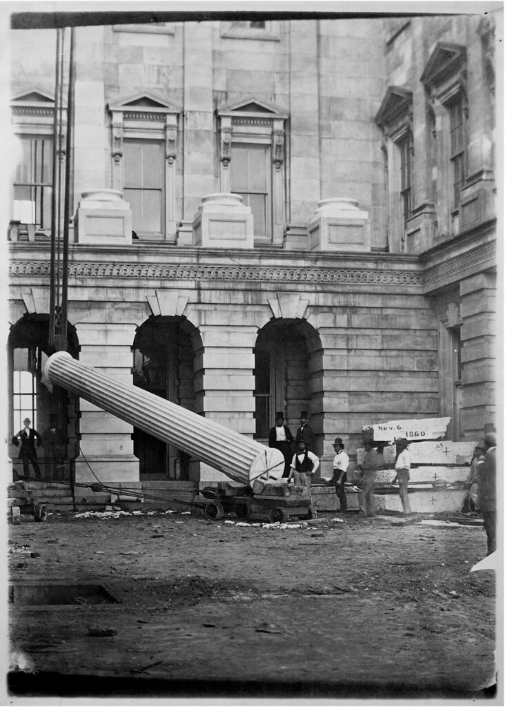 The ‘Lincoln column,’ first monolith raised, Nov. 1860, Presidential election, being S. column of connecting corridor says the caption of this image in Benjamin Brown French’s album of photographs related to the construction of the capitol and other public buildings. French was the Public Commissioner of Buildings in Washington, D.C. under Franklin Pierce but was fired in the next administration for his anti-slavery views and was reinstated to the position by Abraham Lincoln.