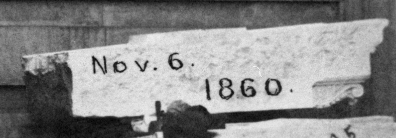 French’s designation of this column as the “Lincoln Column” may simply derive from the date marked on the stone on the right side of the photo, Nov. 6. 1860, election day 1860, when America selected Abraham Lincoln as its next president. Searching online for the phrase “Lincoln column,” I find no references to anything other than the various copies of the photo from French’s album. There are no stories available of any sort of dedication or other kinds of ceremony that might honor this supposedly special column.