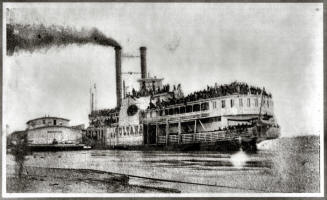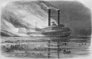 There are two common 19th century images of the Sultana — one a rather poor photograph showing the overcrowded condition on the steamboat and the other a news artists rendition of the disaster from the May 20, 1865 Harper's Weekly.