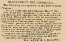 Eds Picayune: Although I have not received any official notice regarding the time when the blockade of the Mississippi River will be established, it may be important to those interested to give such information as I have received from Washington.