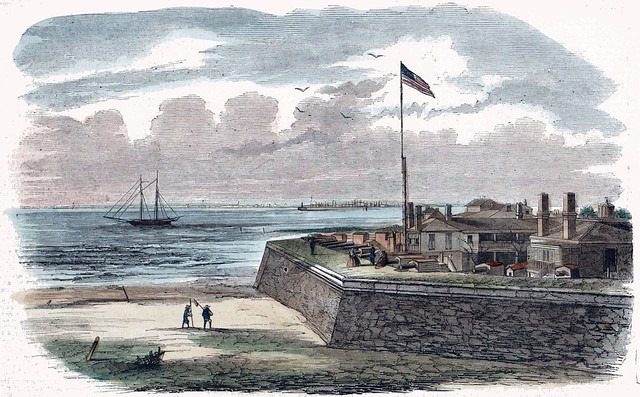 Wood engraving of Moultrie’s southern rampart, barracks, and inner parade-ground as seen from atop the nearby harbor-beacon, with the City of Charleston hazily visible in the far distance. Although originally published in the January 5, 1861 issue of Frank Leslie’s Illustrated Newspaper in New York City — by which date Fort Moultrie had already undergone significant alterations, and been strengthened through erection of additional defenses by its beleaguered Federal garrison, before being abandoned to South Carolinian forces — this peaceful scene depicts the antebellum fort as it had appeared prior to the Secession Crisis and threat of war.