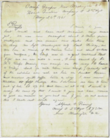 I wrote to you last week and have not received any answer yet, we are now encamped about 2 miles from Washinton and we receive our meals three times a day We left Washington city last Friday, we are on a branch of the Potamac River and about 40 Rods from Maryland, the camp was in a great excitement last night and we were called to arms, it was caused by the U.S. Troops nearing our camp on the way to Guard a bridge about 1/2 mile before our camp, nearly all of the soldiers are well we live on Smoked Bacon and crackers with coffee twice a day, I was never healthier or felt better than I do now we have to turn out of bed at 4 1/2 OC and turn in at 10 OC. I wrote to archy the same day that I worte to you and have received as good an answer as you sent me if you do not answer this I shall not write again.