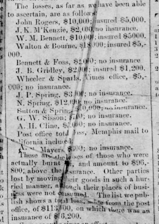 On Thursday morning, at about 4 o’clock, our citizens were aroused by the alarm of fire. The fire originated in the post-office block—probably in the room occupied as a billiard saloon. When first entered, the room was so completely filled with smoke as to render it utterly impossible to remain but a moment. The floor was fired near the door and immediately behind the counter. Our city being destitute of a fire engine, or any organized fire department, a long time elapsed after the alarm of fire was given before a sufficient number of persons reached the ground to effectually suppress the further progress of the flames and by the time the citizens were aroused all efforts to save the block in which the fire originated were useless. The entire block occupied by A. H. Cline, druggist, the post office; J. P. Spring’s law office; Gridley’s billiard saloon; Sutton & Spring, merchants; the Fort Smith Times office; Walton & Bourne, merchants; Beaner & Foss, merchants; G. W. Sisson, daguerotype gallery; and A. M. Callahan & Co., boot and shoe dealers, was entirely consumed—as was also the City Hotel. Very fortunately, it was a still, calm morning and to this is due the preservation of the opposite block. For a long time it was in imminent danger, but well directed and persevering efforts saved it.